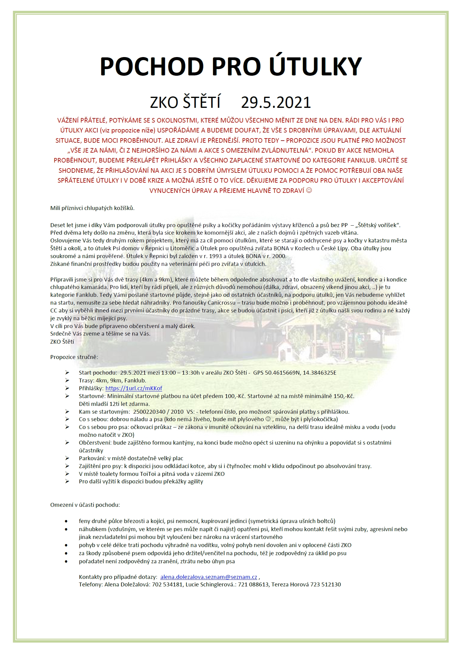 VÁŽENÍ PŘÁTELÉ, POTÝKÁME SE S OKOLNOSTMI, KTERÉ MŮŽOU VŠECHNO MĚNIT ZE DNE NA DEN. RÁDI PRO VÁS I PRO ÚTULKY AKCI USPOŘÁDÁME A BUDEME DOUFAT, ŽE VŠE S DROBNÝMI ÚPRAVAMI, DLE AKTUÁLNÍ SITUACE, BUDE MOCI PROBĚHNOUT. ALE ZDRAVÍ JE PŘEDNĚJŠÍ. PROTO TEDY – PROPOZICE JSOU PLATNÉ PRO MOŽNOST „VŠE JE ZA NÁMI, ČI Z NEJHORŠÍHO ZA NÁMI A AKCE S OMEZENÍM ZVLÁDNUTELNÁ“. POKUD BY AKCE NEMOHLA PROBĚHNOUT, BUDEME PŘEKLÁPĚT PŘIHLÁŠKY A VŠECHNO ZAPLACENÉ STARTOVNÉ DO KATEGORIE FANKLUB. URČITĚ SE SHODNEME, ŽE PŘIHLAŠOVÁNÍ NA AKCI JE S DOBRÝM ÚMYSLEM ÚTULKU POMOCI A ŽE POMOC POTŘEBUJÍ OBA NAŠE SPŘÁTELENÉ ÚTULKY I V DOBĚ KRIZE A MOŽNÁ JEŠTĚ O TO VÍCE. DĚKUJEME ZA PODPORU PRO ÚTULKY I AKCEPTOVÁNÍ VYNUCENÝCH ÚPRAV A PŘEJEME HLAVNĚ TO ZDRAVÍ :-)